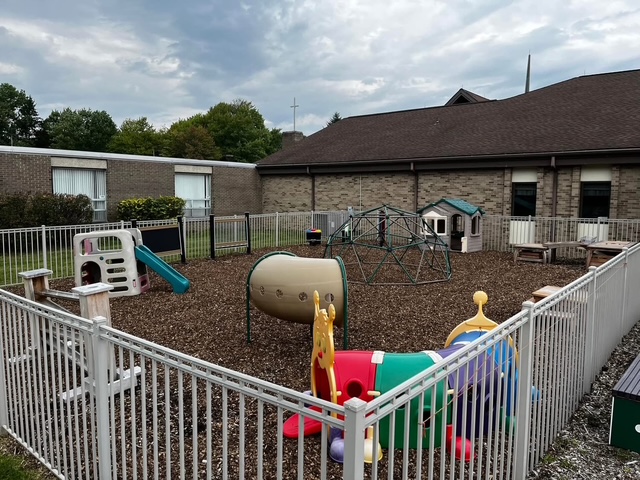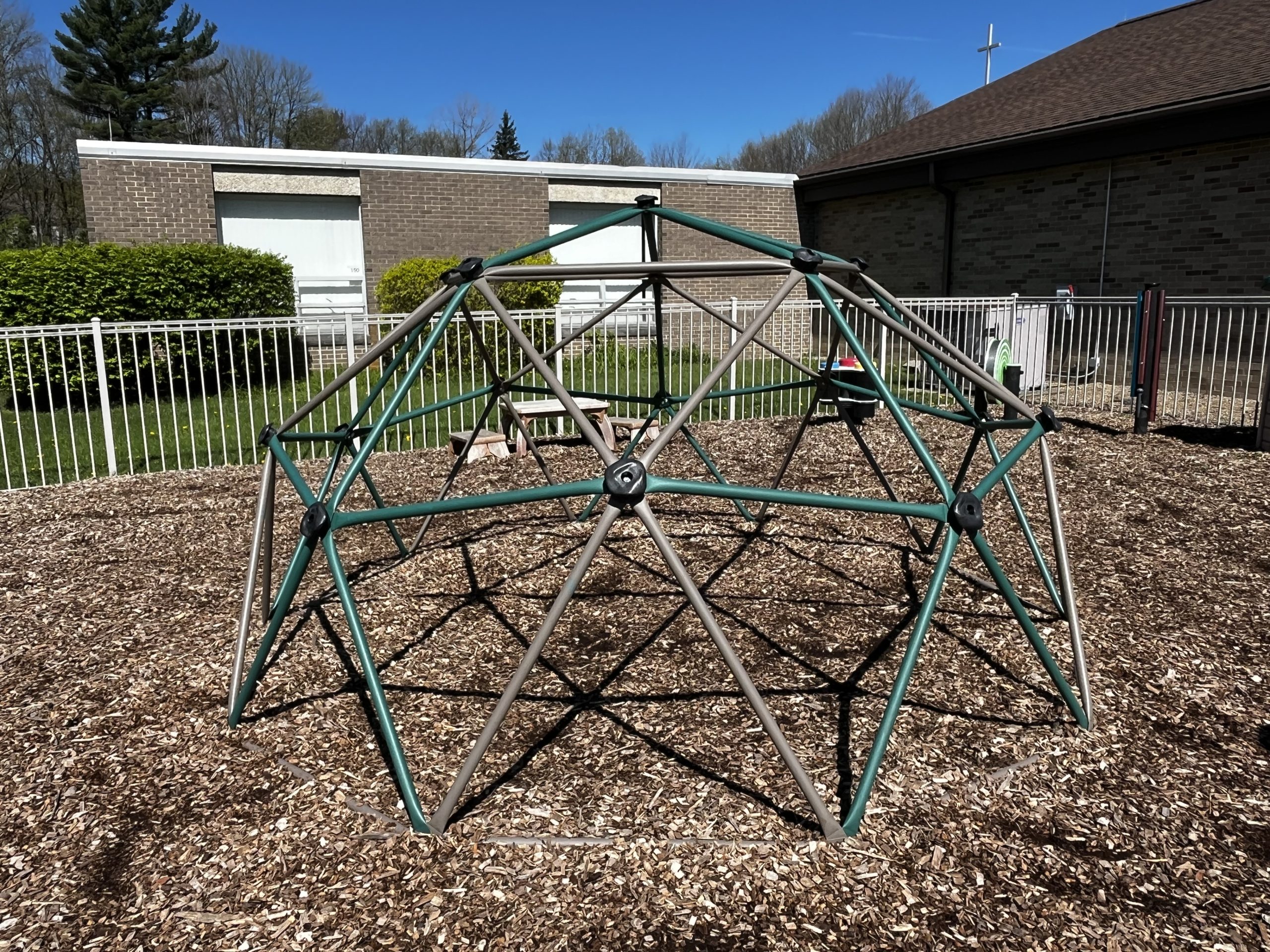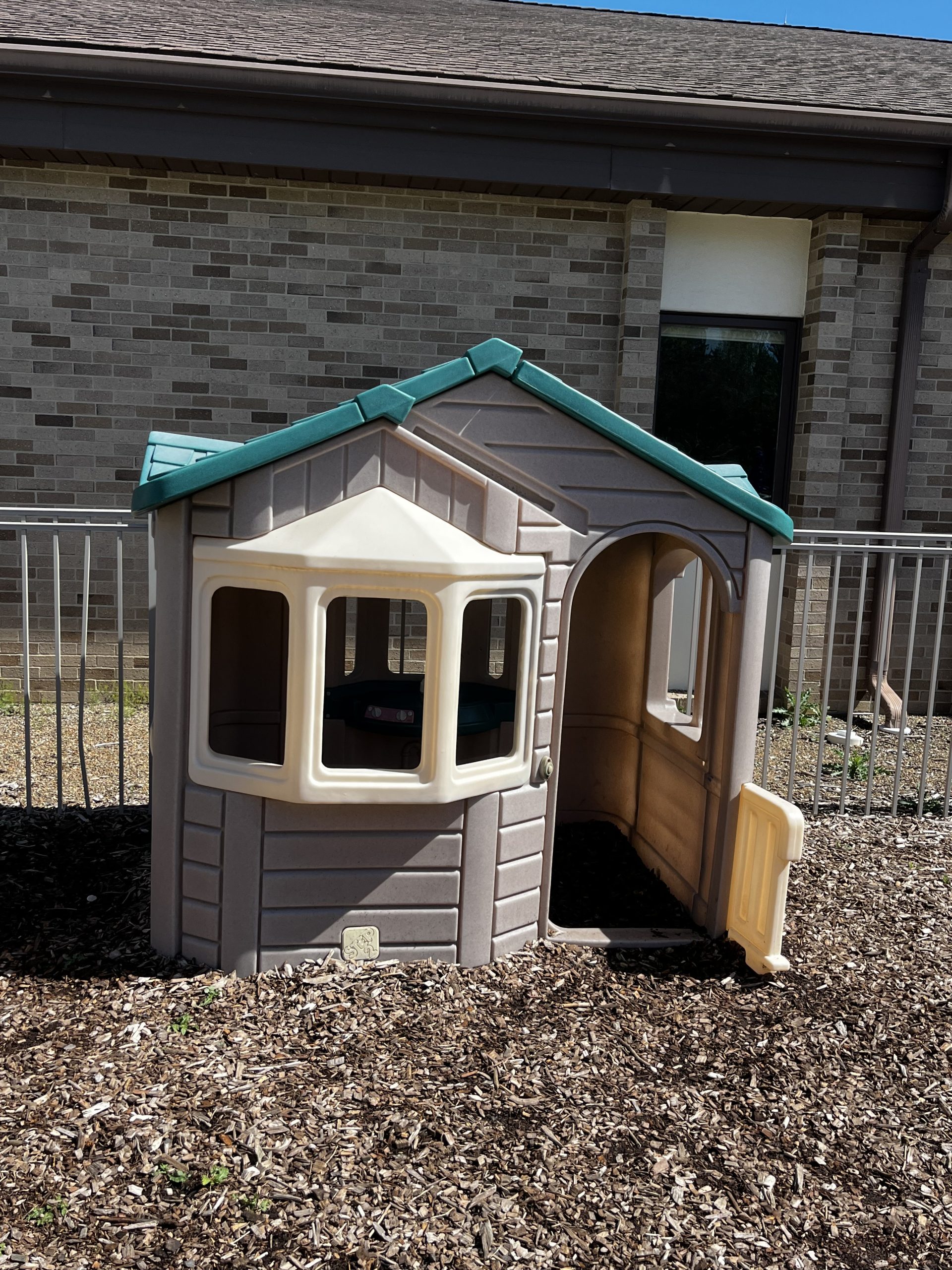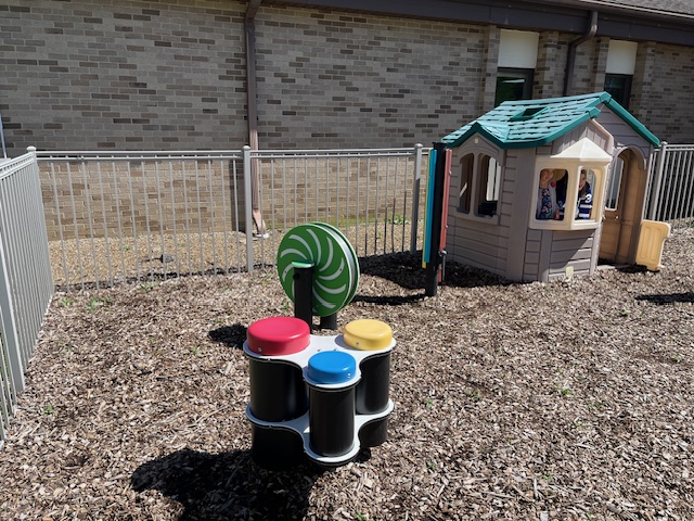 Our playground is equipped with appropriate size equipment for 2-5 year old children with a dome climber, slide, tunnel, playhouse, cascading water/sand table, and musical instruments.