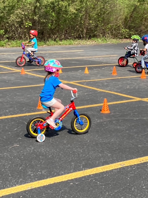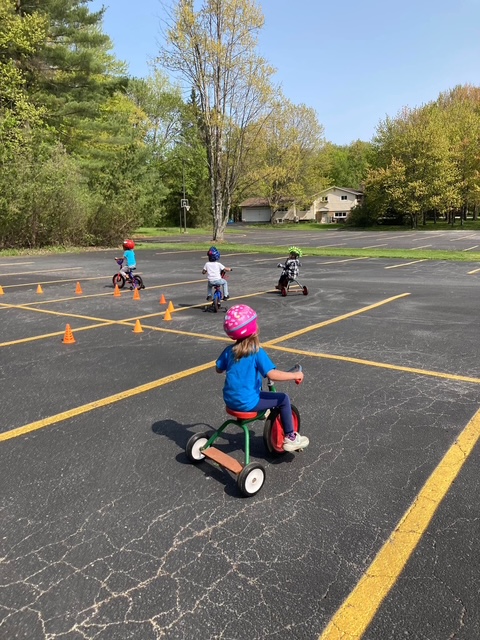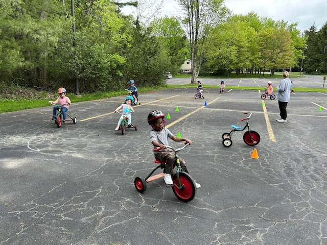 Each class has time in the bike area weekly in a coned-off black-top zone equipped with bikes, tricycles, scooters, and ride-on toys. Additional equipment for gross motor play including basketball hoops, toy workbenches, and rakes and wheelbarrows are used in the bike area to complement free play.