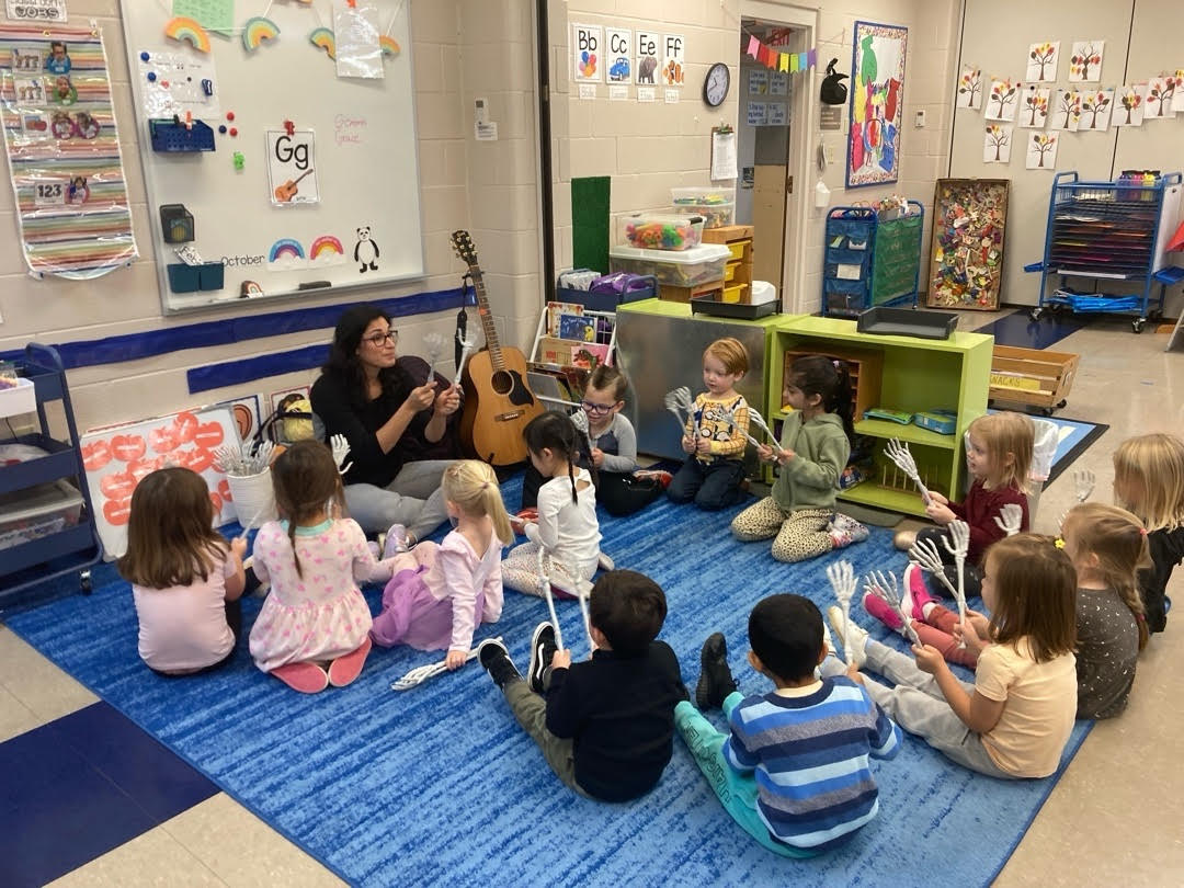 Music – once a month the Groovy Garfoose comes to Play and Prep with a music lesson perfect for our preschool classes.  Each month the themed lesson exposes the students to music as they engage through instrument playing, singing, musical games, movement, and more.